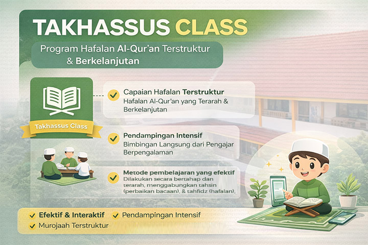 Takhassus Class menjadi pilihan bagi siswa yang ingin memperdalam kemampuan hafalan Al-Qur’an. Program ini menitikberatkan pada capaian hafalan yang terstruktur dan berkelanjutan, didukung dengan metode pembelajaran yang efektif serta pendampingan intensif dari para pengajar. Selain itu, kelas Takhassus unggul dalam menghadirkan pembinaan yang lebih fokus dan terarah, dengan target hafalan yang jelas, lingkungan belajar yang kondusif, serta pembentukan karakter Qur’ani yang menjadi ruh dalam setiap proses pembelajaran.